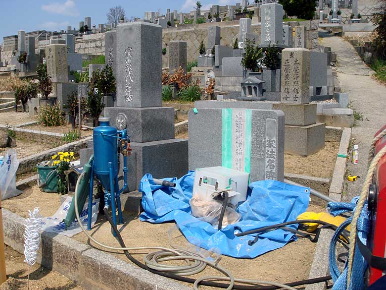 現場字彫に行きました。高台で眺めの良い墓地です。あわせてペンキ入れをしました。