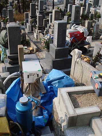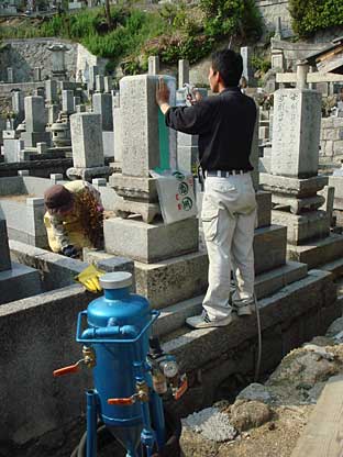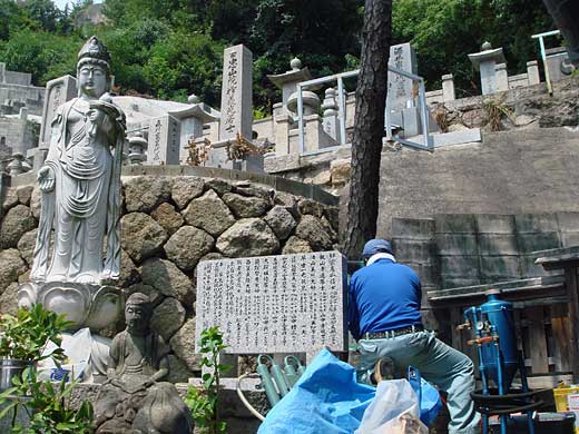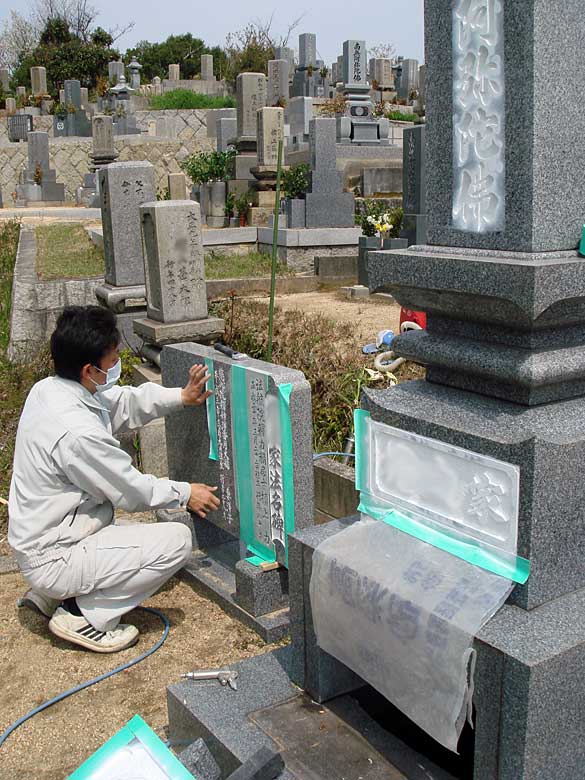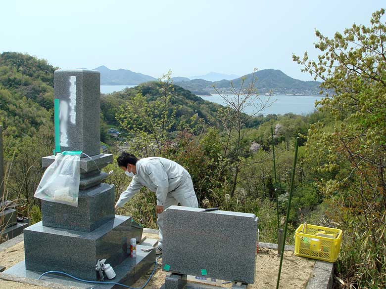 現場字彫りを行いました。高所の墓地ですが、近年は高い建物に遮られ、海も見え難くなりました。