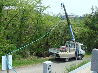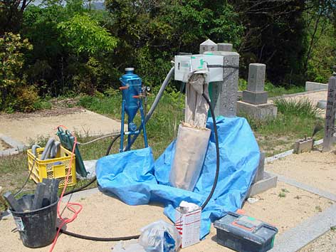 花見も終わった時期ですが、現場字彫りに行きました。ここの墓地周辺はシーズンには渋滞する為、ご法事間近の作業になりました。道の反対側に車を止め、エアホースを上方から墓地に回しました。