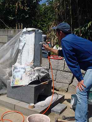 字彫りを終えた法名碑を納め、現場にて墓のペンキ入れを行いました。