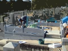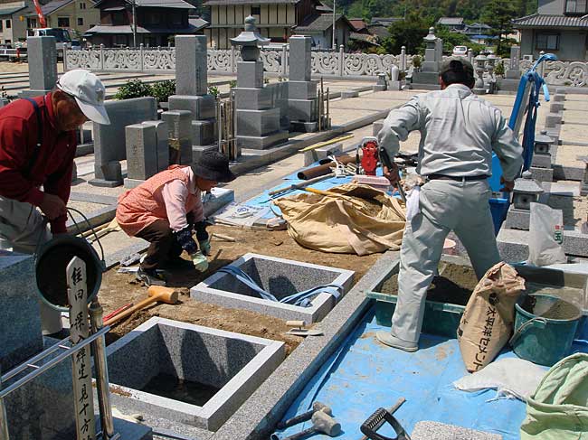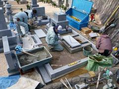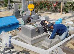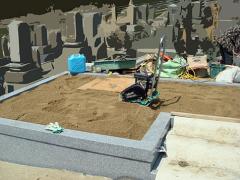 墓地内を更地にし、防草シートを施工して順番に墓の据付を行いました。同じ墓地ながら、ゆとりを感じられる墓地に成られたと思いました。お世話様に成りました。12~13日