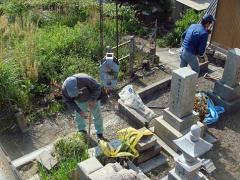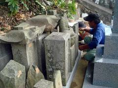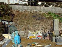 新規の墓のご注文をいただき、既存の墓の向きの変更と擁壁の狂いによる、巻き石の直しを行いました。内部の土を出して擁壁内部へ杭打ちをし、杭を支持体として再度巻き石を組みました。その後、墓を一時撤去しました。