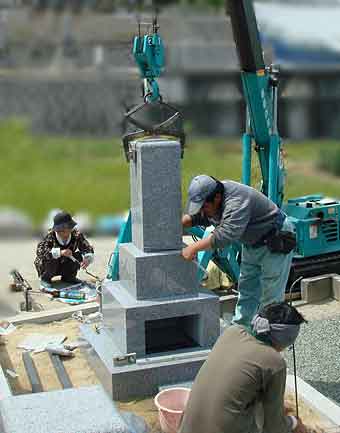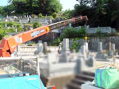 古墓の整理と巻き石の設置に行きました。クレーンでクレーンを下ろして、作業に当たりました。