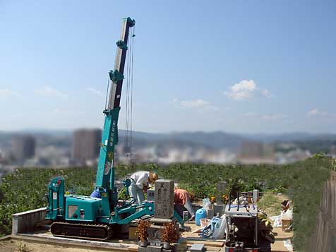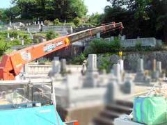 高所の墓地なので、中継用にクレーンを一台置いています。後ろに先祖の方の仏石を設置され、二つの墓地が五輪塔で、一つにまとまられました。将来的な空きも確保出来て、お喜びいただけました。有難うございました。