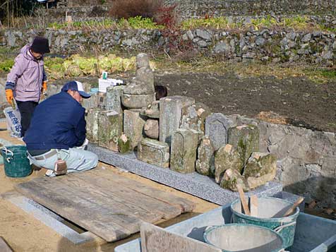 五輪塔にまとめられる、古い墓の撤去の準備を行い、二箇所の墓地から十三基分の台石を運び出しました。