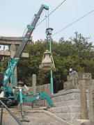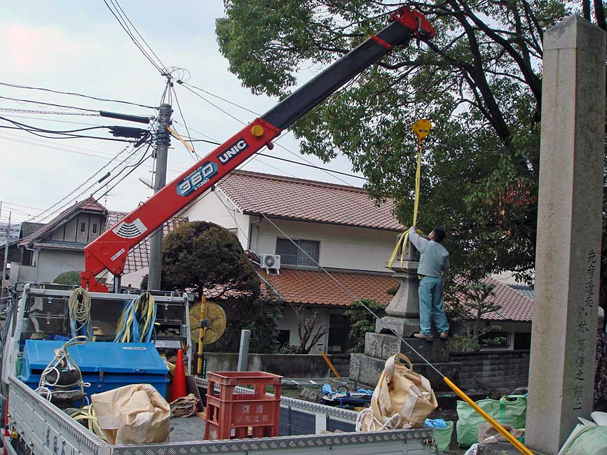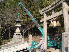 移転先に解体した燈篭を施工しました。坂道の為、安全性を考えカートクレーン(通称カニクレーン)を使用しました。