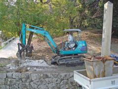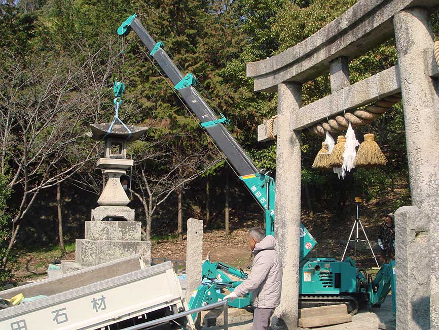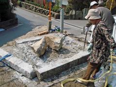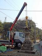 道路拡張に伴う燈篭の移転作業に行きました。初日は一基目を解体し、少し上の移転場所に、下の部分を施工しました。