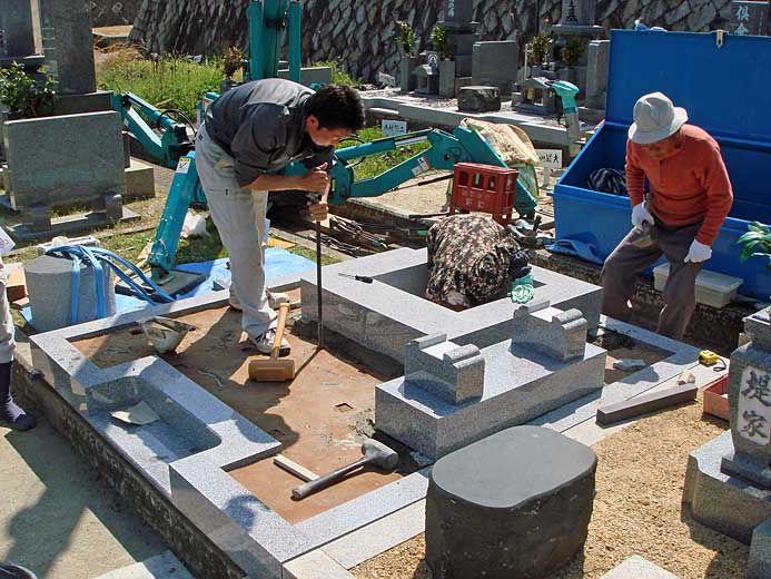 先祖墓の施工に行きました。本堂前にて小さい運搬車に積み替えて、さらに階段を上がります。初日に搬入をして、翌日据付をしました。 25日~26日