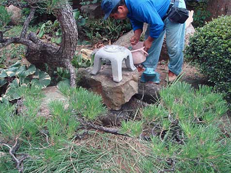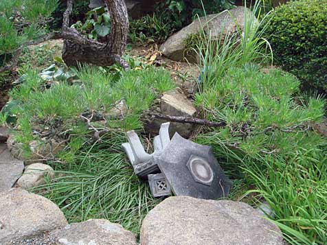 盆休みの間に連絡を頂いていたのですが、突然に庭灯籠が転倒したとのことで、直しに行きました。幸い大した破損もありませんでしたが、灯籠の下の石に原因がありました。造園屋さんの施工に問題が?侘び寂も分からない者がとりあえず修復しました。