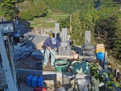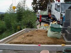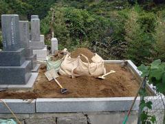 墓地内を更地にし、防草シートを施工して順番に墓の据付を行いました。同じ墓地ながら、ゆとりを感じられる墓地に成られたと思いました。お世話様に成りました。12~13日