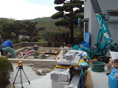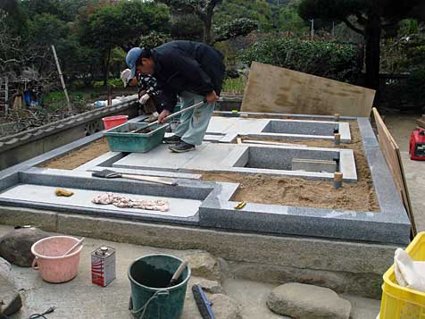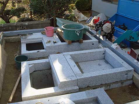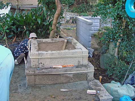 巻き石を施工し、墓が据わる土台石等を搬入しました。全て完成すれば見えない部分ですが、使用才数が凄いです。18~19日