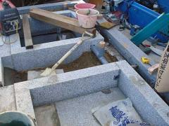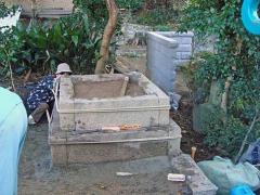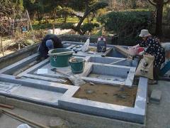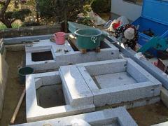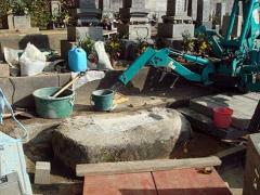 新規の墓のご注文をいただき、既存の墓の向きの変更と擁壁の狂いによる、巻き石の直しを行いました。内部の土を出して擁壁内部へ杭打ちをし、杭を支持体として再度巻き石を組みました。その後、墓を一時撤去しました。