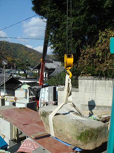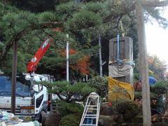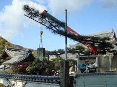 境内に有る英霊供養塔の搬出作業を行いました。上を縦横するご立派な松が有り、気も遣いましたが台石と無事離れました。供養塔の移転先は、25tクレーンでも搬入が無理と言われた場所なので、これから足場を組みます。