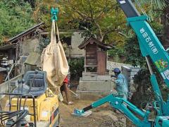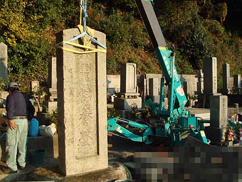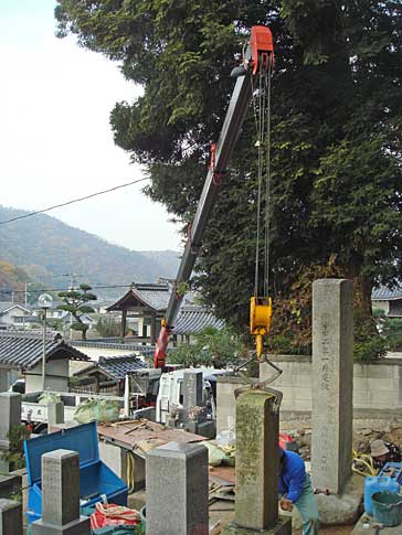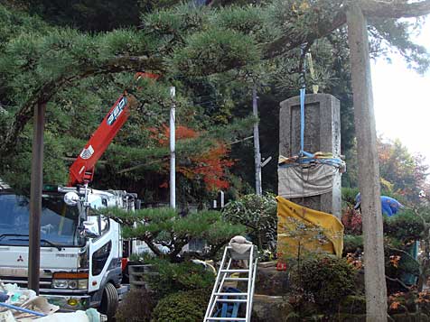 英霊供養塔の横に移転する墓の引越しを行いました。普通の大きさなのでユニックだけの作業です。昨日まで使用した足場の撤去と、一時的に立ち退いて頂いた墓を設置しました。