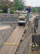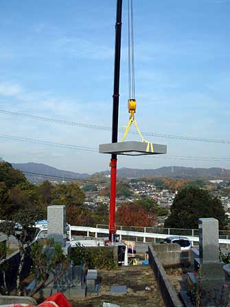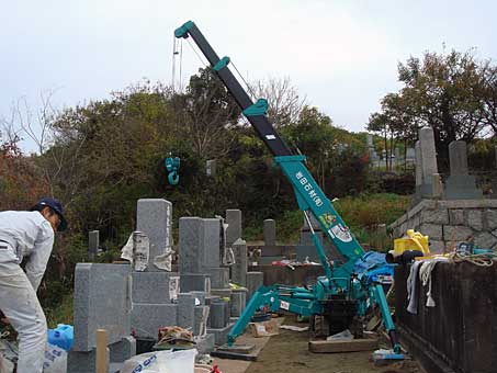 夫婦墓の傾き直しに行きました。クレーンがどうにか届く距離での作業です。同じ墓地へ来週施工する、先祖墓の下回りの設置も同時に行いました。