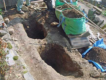 一番新しい墓地を活用される為に、巻き石の施工を行い、同じ昌源時様の墓地で三ヶ所目の墓の撤去と土葬掘りを行いました。15~17日