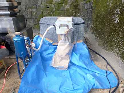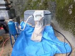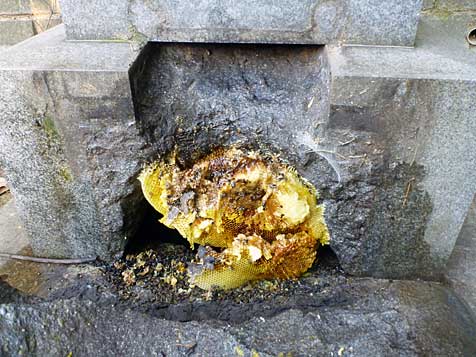 「蜂が墓に巣を作っているので何とかして下さい」とのことで早速行ってみました。花立を少し傾けると物凄い蜂の巣。耳を澄ませば相当数であろう「ブーン」という羽の音。殺虫剤と熱風と火により、この日は巣だけ撤去しました。